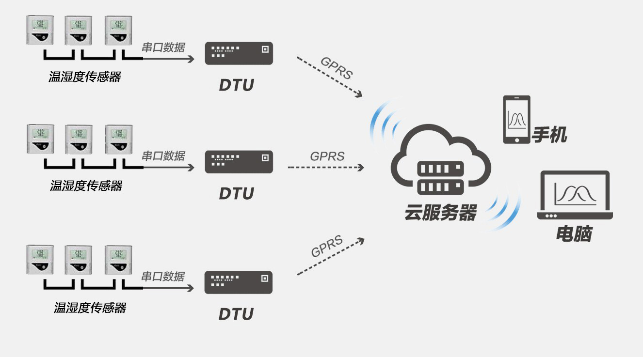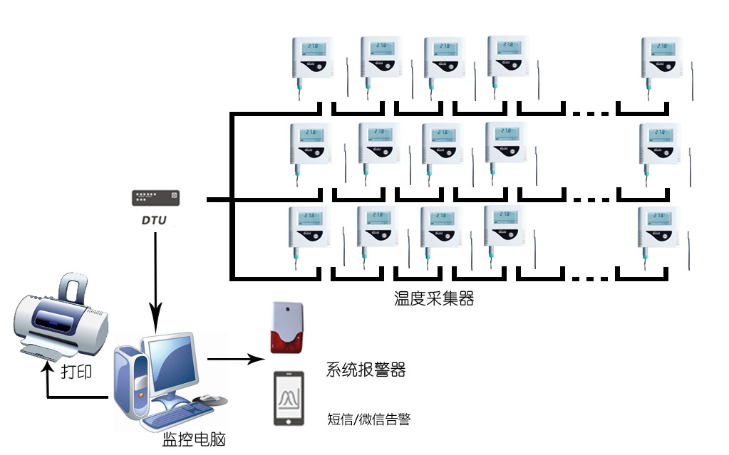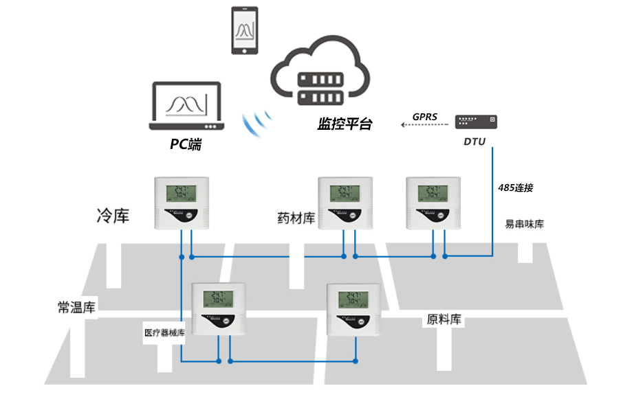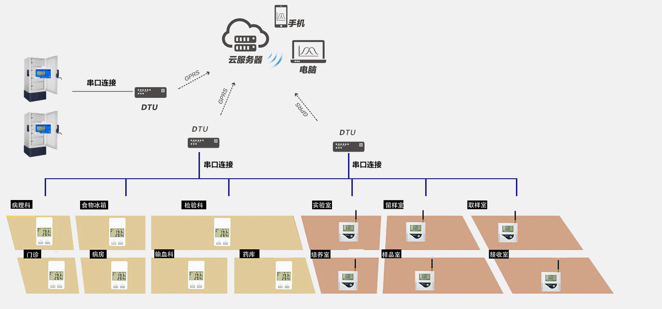 溫濕度監(jiān)測(cè)系統(tǒng)是利用DTU物聯(lián)網(wǎng)智能采集設(shè)備,對(duì)血車(chē)、血漿庫(kù)、保鮮庫(kù)、儲(chǔ)藏柜、冰箱、冷凍柜、醫(yī)院、機(jī)房、干燥箱等多點(diǎn)的溫度、濕度進(jìn)行無(wú)線聯(lián)網(wǎng)監(jiān)測(cè)記錄,通過(guò)DTU物聯(lián)網(wǎng)智能采集設(shè)備將溫度、濕度數(shù)據(jù)傳輸?shù)捷x和科技云平臺(tái),進(jìn)行統(tǒng)一監(jiān)控、管理以報(bào)表、曲線等形式顯示出來(lái),系統(tǒng)具有自動(dòng)記錄存儲(chǔ)、打印曲線和報(bào)表、歷史數(shù)據(jù)查詢、自動(dòng)報(bào)警等功能。