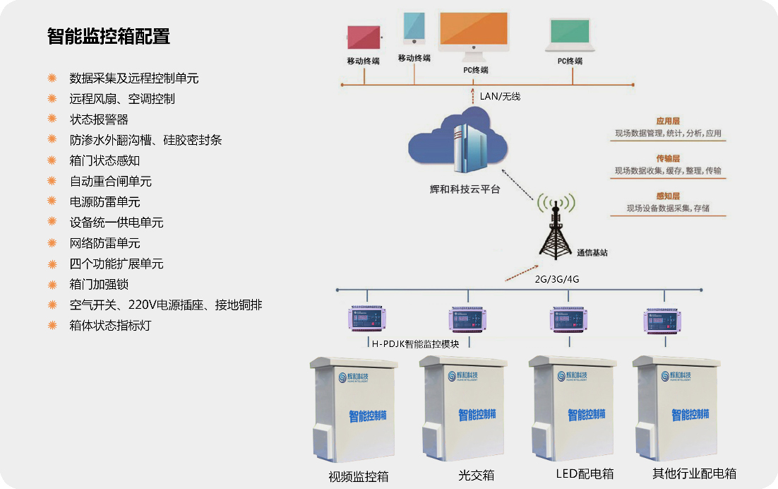 輝和智能監(jiān)控運維綜合管理系統(tǒng)分為:數(shù)據(jù)采集層 、信息傳輸以及輝和科技云管理平臺。