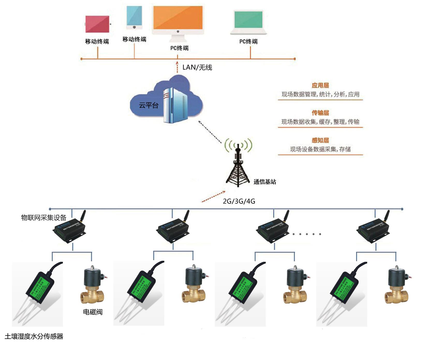 數(shù)據(jù)采集層,實時采集被監(jiān)測現(xiàn)場數(shù)據(jù)信息。包括土壤水分濕度(可根據(jù)監(jiān)測需求增加對應傳感器,監(jiān)測土壤溫度、土壤電導率、土壤PH值等數(shù)據(jù)監(jiān)測),通過RS485總線連接到物聯(lián)網(wǎng)采集設備;電磁閥通過模擬量接口連接到物聯(lián)網(wǎng)采集設備;實時采集土壤濕度的數(shù)據(jù),灌溉系統(tǒng)的工作狀態(tài),并通過傳輸網(wǎng)絡把數(shù)據(jù)上傳至監(jiān)控中心。