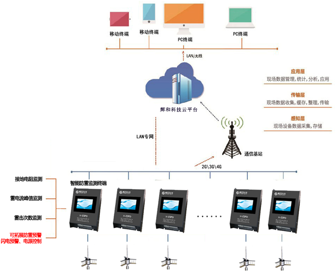 輝和科技避雷針防護(hù)診斷預(yù)警系統(tǒng),由云端服務(wù)平臺(tái)、系統(tǒng)報(bào)警設(shè)備、前端采集設(shè)備組成。在現(xiàn)場(chǎng)安裝智慧防雷監(jiān)測(cè)終端,通過GPRS通訊信號(hào)與輝和科技云平臺(tái)監(jiān)控系統(tǒng)進(jìn)行通訊。