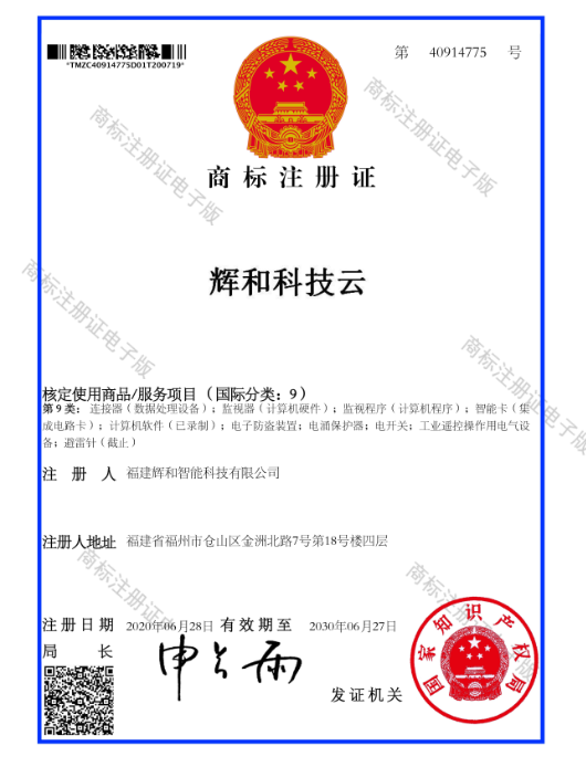 我司申請注冊的 “輝和科技云” 商標(biāo)獲國家商標(biāo)局批準(zhǔn)注冊成功,商標(biāo)注冊證書證號為第40914775號。該商標(biāo)是公司在品牌基礎(chǔ)上新增一張亮麗身份證,是公司發(fā)展輝和科技云品牌建設(shè)史上新里程碑,為輝和科技產(chǎn)品走向全國奠定了堅實基礎(chǔ),對實現(xiàn)公司健康快速發(fā)展具有巨大推動作用。
