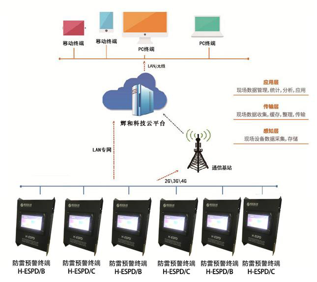 輝和科技云加油站配電系統(tǒng)防雷預(yù)警系統(tǒng),由云端服務(wù)平臺、系統(tǒng)報(bào)警設(shè)備、防雷預(yù)警終端組成。通過GPRS通訊信號與輝和科技云平臺監(jiān)控系統(tǒng)進(jìn)行通訊。