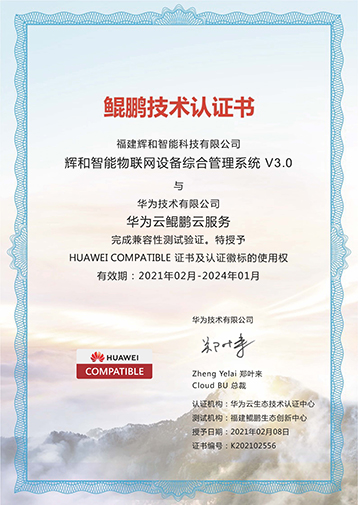 新春伊始 , 福建輝和智能科技有限公司自主研發(fā)的輝和智能物聯(lián)網(wǎng)設(shè)備綜合管理系統(tǒng)通過華為云鯤鵬云服務(wù)兼容性測試驗證。經(jīng)雙方嚴(yán)格測試 , 輝和智能物聯(lián)網(wǎng)設(shè)備綜合管理系統(tǒng)具備優(yōu)秀的兼容性和安全性 , 性能優(yōu)異 , 運行穩(wěn)定 , 完全滿足海量用戶使用要求 , 與華為云鯤鵬云服務(wù)完全兼容適配 , 華為云特授予輝和科技 HUAWEICOMPATIBLE 證書及認(rèn)證徽標(biāo)的使用權(quán)。